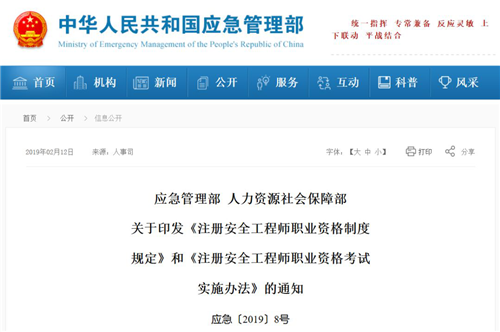 2019年02月12日,中華人民共和國應急管理部發布:應急管理部 人力資源社會保障部關于印發《注冊安全工程師職業資格制度規定》和《注冊安全工程師職業資格考試實施辦法》的通知。