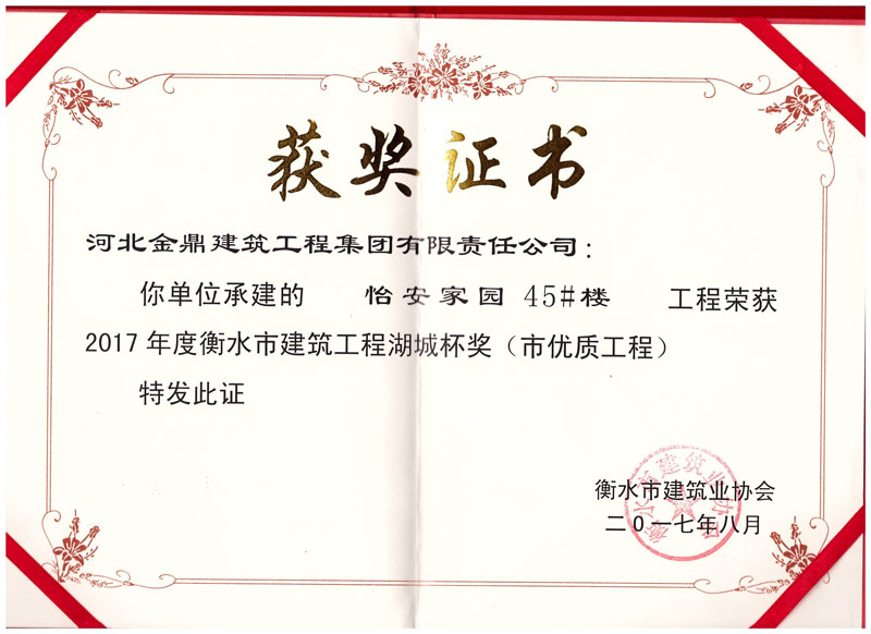 怡安家園45#樓工程榮獲2017年衡水市建筑工程湖城杯獎(市優(yōu)質工程)