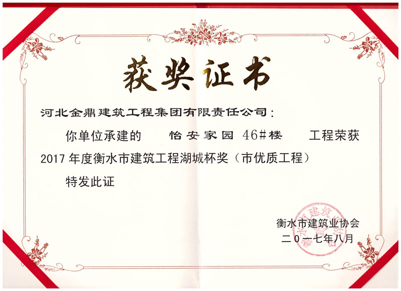 怡安家園46#樓工程榮獲2017年衡水市建筑工程湖城杯獎(市優質工程)